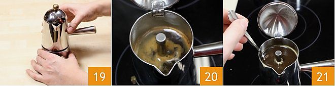 Do not press with the spoon, nor create holes, and screw the coffee maker tight 19 (to avoid coffee leaking from the sides as it rises), then place it on a low and steady flame to obtain a robust coffee. As the coffee rises, a dense foam will form 20; we recommend not letting the coffee bubble too long to preserve its aroma and sweetness. Then turn off the heat, and your coffee to use in the preparation is ready: stir it directly in the moka pot with a teaspoon to make it more homogeneous 21.