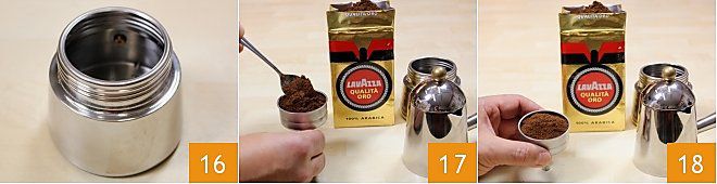 Then prepare the coffee to add to the cream: place cold water, preferably low in calcium, inside the boiler up to the safety valve 16 (otherwise you will get a longer coffee). Fill the filter with ground coffee 17 and level with each added teaspoon of coffee by tapping the filter on the table with firm movements 18, until reaching the edge of the filter.