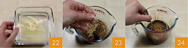 Now, soak the gelatin in cold water for 10 minutes 22. After the necessary time, squeeze it and add it to the freshly made coffee to dissolve, stirring with a teaspoon (23-24).