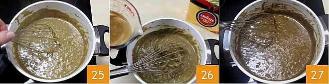 At this point, take back the saucepan with the coffee cream that you thickened over low heat by stirring with the whisk 25 and gradually add the coffee with the dissolved gelatin 26. Stir with the whisk, and if the cream seems too liquid, put the saucepan back on low heat to thicken while continuing to stir with the whisk 27.