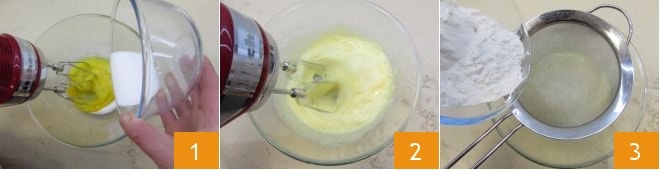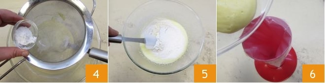 Sift the yeast into the bowl as well 4 and gently mix with the other ingredients using a spatula 5: you should make gentle movements from bottom to top to incorporate the sifted ingredients without deflating the mixture. Once the ingredients are well combined, transfer the mixture into a pastry bag 6.