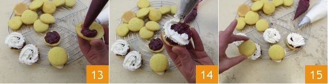 Start filling the surface of 10 shells with the jam 13. Also decorate with the whipped cream 14, then place the other shells on top to close 15: you will get 10 tasty kisses.