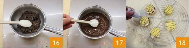 Finally, take the chocolate, chop it and melt it in a double boiler like this: place a small pot with a little water on the stove and place a bowl on top where you will pour the chocolate to melt 16; melt it in a double boiler, stirring with a wooden spoon 17. Once it's well melted, transfer it into a parchment paper cone you have shaped like a pastry bag (for more detail you can consult our cooking school on how to make a cone with parchment paper): decorate your tasty kisses by drawing parallel lines on the top shell of the cookies 18 and... enjoy!