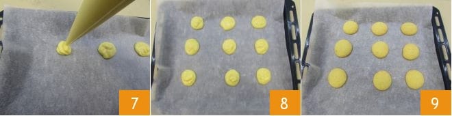 At this point, line a baking sheet with parchment paper and create small dough discs about 1.18 inches in diameter 7, making sure to space them well apart. You should obtain 20 discs 8 that you will bake in a static preheated oven at 374°F for 12 minutes (we do not recommend using a convection oven): the cookies should slightly puff up and take on a light golden color 9.