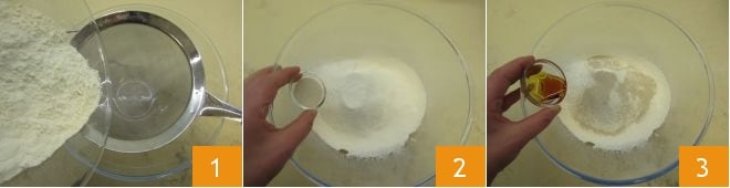 To make the bagels, start by sifting the flour into a bowl 1, then add the dry yeast 2 and malt 3.
