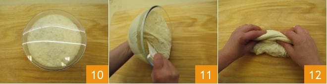 Once the dough has tripled in volume 10, transfer it back to the work surface with the help of a scraper 11 and use your hands to form a log 12.
