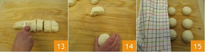 Cut this into 6 pieces of about 3 oz each; you can use a scraper or a sharp knife to cut them 13. Using the palm of your hand, transform each piece into a ball, applying slight pressure against the work surface and rotating 14. Repeat for all 6 balls, then cover with a kitchen towel 15 and let rest for about ten minutes.