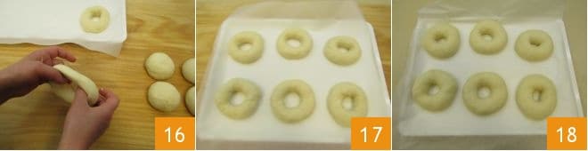 At this point, by inserting your fingers in the center of each sphere and stretching them outward, you'll create your bagels, about 4 inches in diameter 16. As you go, place the bagels on a tray lined with parchment paper 17, then let them rise for another 40-50 minutes again at a temperature of 82-86°F or in the oven turned off with the light on, until they have doubled in volume 18. Meanwhile, place a pot with water on the stove and bring to a boil.