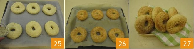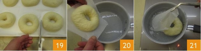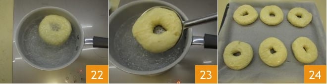 Cook the bagels for about 20 seconds on each side 22, then use a slotted spoon to drain them 23 and place them on a baking sheet lined with parchment paper 24.