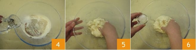 Also, add the room temperature water gradually 4 and start kneading with your hands 5; once you have a homogeneous mixture, you can add the salt 6 and continue working it until it is completely absorbed.