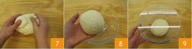 At this point, transfer the mixture to a work surface and knead it for about 5-6 minutes 7 until you get a smooth and homogeneous dough; then place it in a large bowl 8, cover with plastic wrap 9, and let it rise for about 4 hours at a temperature of 82-86°F (even the oven turned off with the light on will be fine). If you want to avoid plastic wrap, you can place the dough on a cutting board and cover it with a large bowl to keep it well covered and prevent contact with air that would create a crust on the surface, making leavening more difficult.