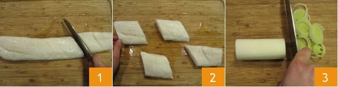 To prepare the baked cod, first cut the cod fillet (already desalted) into four pieces (1-2). Wash and slice the leek 3.