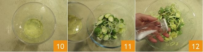 until you obtain a smooth and homogeneous sauce 10. In a bowl, mix the leek with the Brussels sprouts and dress with part of the emulsion 11; adjust the salt but moderately 12, considering that the cod, even when desalted, will still be quite savory.