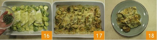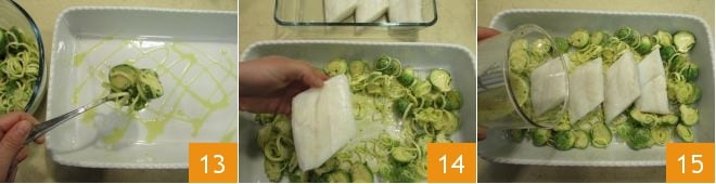 In a baking dish lightly oiled at the bottom, pour the already seasoned side dish 13 and place the cod fillets in the center 14, which you will drizzle with the remaining emulsion 15.