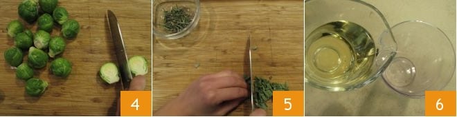 Wash the Brussels sprouts, remove the outer leaves if they are a bit wilted, then cut them in half 4. Finely chop sage and rosemary 5. Set aside these ingredients and focus on the dressing sauce: in a tall glass, pour the white wine 6,