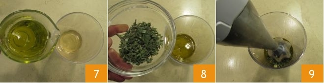 the mustard, the olive oil 7, and half of the chopped herbs as per the recipe 8. Blend everything with an immersion blender 9