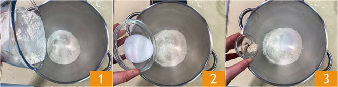 To prepare the donut dough, pour the all-purpose flour and bread flour 1, sugar 2, and crumbled fresh yeast 3 into a stand mixer equipped with a hook attachment.