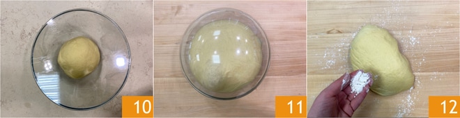 Place the dough inside a bowl, cover with plastic wrap, and let it rise at a temperature of 78°F-82°F for about 3 and a half hours 10, or until it has tripled in volume 11. After the rising time, transfer the dough to a lightly floured board 12.