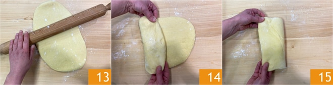 Roll it out slightly with a rolling pin to form a rectangle about 0.8 inches thick 13. Fold one of the shorter sides inward 14, the left one, bringing it towards the center so that when the other side is folded, it aligns with the first fold 15.