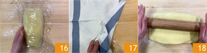 Cover with plastic wrap 16 and a kitchen towel 17 and let rest for 10 minutes. After 10 minutes, turn and roll out the dough again with the rolling pin, giving it a rectangular shape 18.