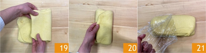 Proceed with 2 more folds starting from the right side 19 and then the left side 20. Let the dough rest 21 for another 10 minutes, making sure to cover it with plastic wrap and a kitchen towel. Repeat the folds and the 10-minute rest one more time (for a total of 3 times).