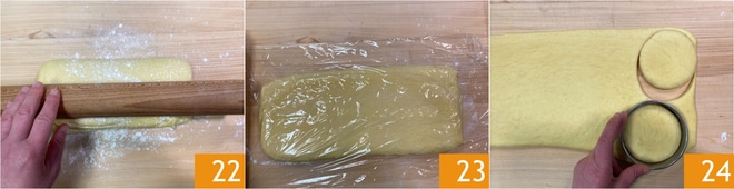 After the resting time, roll out the dough on a board with the rolling pin to a thickness of about 0.5 inches 22. Cover with plastic wrap and let it rest for 10 minutes before cutting the dough because if cut immediately, it tends to shrink 23. Using a cookie cutter with a diameter of 3.5 inches, cut out dough disks 24: you will get 10 (alternatively, you can use the edge of a glass for cutting).