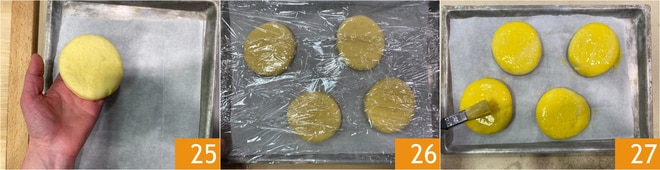 As you go, transfer them to a tray lined with parchment paper 25. Once ready, cover with plastic wrap. Let the donuts rise in a dry place for about 45 minutes 26. Brush them with beaten yolk and cream 27.