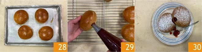 Bake in a preheated static oven at 347°F for 20-25 minutes. Then take the donuts out of the oven 28 and let them cool slightly. Once cooled, transfer the jam into a piping bag fitted with a plain nozzle and fill the donuts 29. Dust with powdered sugar and serve your delicious baked donuts 30!