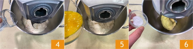 Start the mixer and gradually pour in the water 4, then add the beaten eggs little by little 5. Once the dough is formed, add the salt 6. Let the mixer run at medium speed for about 3-4 minutes.