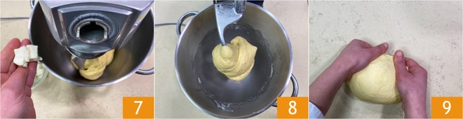 When the dough detaches from the sides of the bowl, incorporate the softened butter, one piece at a time 7, waiting for each piece to be absorbed before adding the next. Once all the butter is absorbed, knead the dough for about 10 more minutes, until smooth and compact 8. Transfer the dough to a work surface, give it a couple of folds, and form a ball 9.