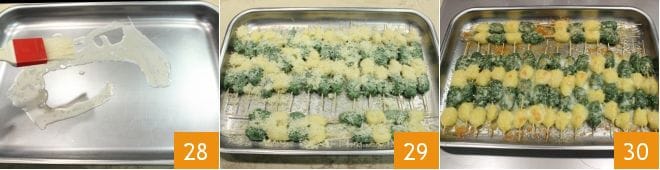then brush with melted butter a baking tray large enough to hold the skewers 28. Lay the skewers on the tray and brush the surface with more melted butter and grated cheeses 29. Grill in a preheated oven with the grill function for 10 minutes at 430°F. Once cooked, remove the baked gnocchi skewers from the oven 30 and serve them hot.
