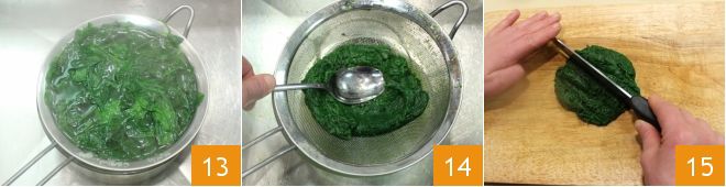 Once cooked, drain the spinach and squeeze them well using a sieve (13-14), then chop them finely with a knife 15.