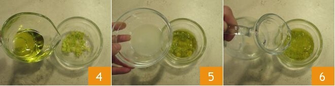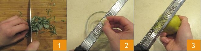 To prepare the baked grouper with artichokes, first make the dressing: finely chop the sage and rosemary 1, then grate the garlic cloves 2 and the zest of one lemon into a small bowl 3.