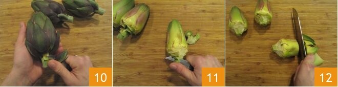 Now it's time to clean the artichokes: remove the tougher leaves 10 and the outer layer of the stem 11, then cut off the top end 12.