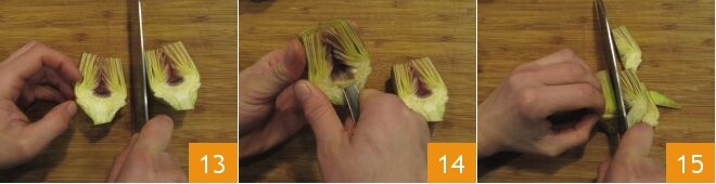 Cut the artichokes in half 13, remove the central fuzz 14, and slice them lengthwise into not too thin slices 15, immersing them gradually in the acidulated water: you will need about 5 oz of cleaned and cut artichokes in total.