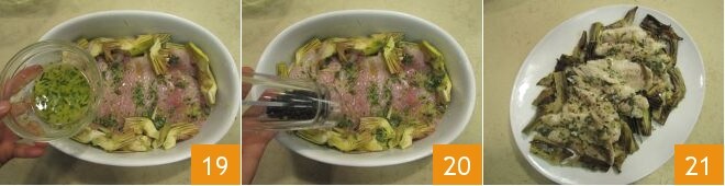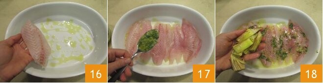 Grease a baking dish measuring about 12x8 inches with a drizzle of oil and place the cleaned grouper fillets inside 16, season with salt and some of the dressing prepared earlier 17. Arrange the artichokes around the fillets 18,