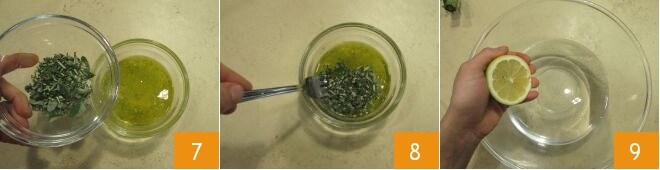 and the previously chopped herbs 7, mix well 8, and set aside for now. Fill a bowl with water and squeeze the juice of half a lemon into it 9: this will be used to soak the artichokes after cleaning and cutting them to prevent them from turning brown.