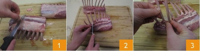 To prepare the baked lamb chops, start by trimming the excess fat from the meat 1, then make cuts between each rib 2 and use your fingers to push the meat down, cleaning the bone as much as possible 3.