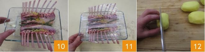 Also add a halved clove of garlic 10, cover with plastic wrap 11, and let marinate for about 2 hours in the refrigerator. After this time, peel the potatoes and cut them in half 12.