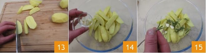 Further cut the potatoes into wedges 13. Transfer them to a bowl and season with a clove of garlic cut into 4 14 and the rosemary needles 15.