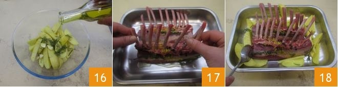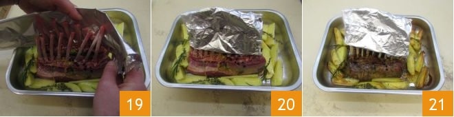 Wrap the bones with a strip of aluminum foil 19, fully covering them 20 to prevent burning while cooking. Bake in a preheated static oven at 392°F for 50 minutes (using a fan oven is not recommended as the chops may dry out too much). Once cooked, take out and serve your baked lamb chops immediately 21!
