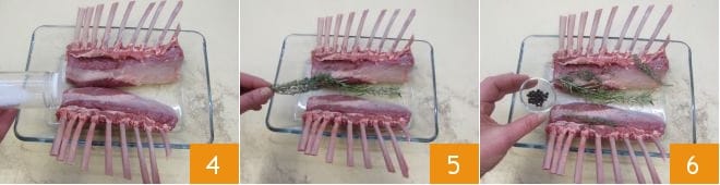 Place the chops in a baking dish and season with salt 4 and pepper. Add 2 sprigs of rosemary, the thyme 5, and the peppercorns 6.