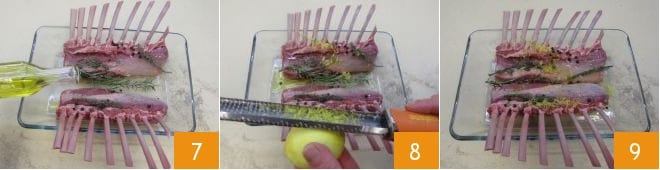 Pour about 2 teaspoons of oil 7, add the freshly grated lemon zest 8, making sure to sprinkle over all the chops 9.