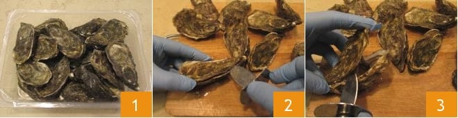 To prepare the baked oysters with mushrooms, you need to open the oysters: For lemon and pepper oysters, make sure the oyster shells are closed 1, then open the oysters, which is a very delicate operation. Use the special knife with a thin tip, with finger protection, and a firm grip. Hold the oyster securely with one hand and with the other, grip the knife and look for the opening (you can request pre-drilled oysters at the fish market for easier opening). Insert the blade and cut the muscle located in the center 2; once it's cut, it will be easier to follow the circumference to open the oyster entirely 3.