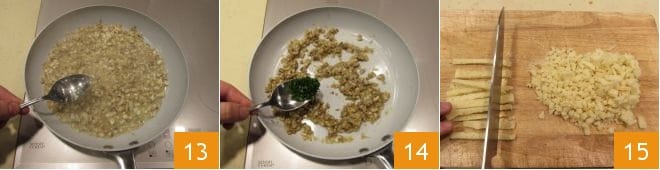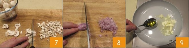 add the chopped shallot 10 and let it soften for 10 minutes, adding a little warm water 11, then add the champignon mushrooms 12,