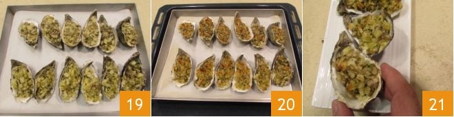 Place the shells on a baking tray 19 and grill in the oven for 5 minutes until the breadcrumb topping is crispy and golden 20. Remove the baked oysters with mushrooms from the oven and let them cool slightly before serving 21.