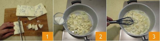 To prepare the baked gorgonzola pasta, first cook the pasta al dente in a pot of boiling salted water. Take the gorgonzola, cut it into strips and then into chunks 1. In a pan, add the gorgonzola, pour in the milk to dilute the cheese and make it creamy 2 and stir with a whisk 3.