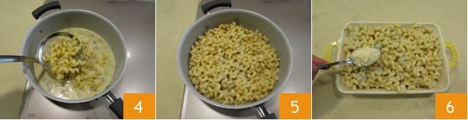 Cook over moderate heat for 2 or 3 minutes, until you obtain a smooth cream. Once the pasta is ready, drain it and transfer it to the pan with the sauce 4, mixing everything well 5. Place the pasta in a 10x7 inch rectangular baking dish and sprinkle it with plenty of Grana 6.