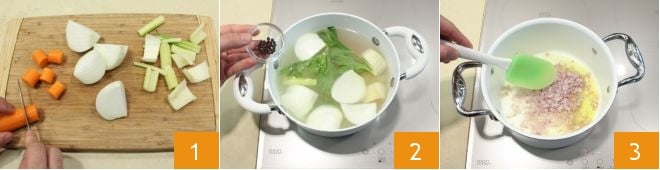To prepare the baked rice croquettes, start by making the broth to cook the rice. Wash, peel, and chop the celery, carrot, and onion 1, place the water in a large pot, add the vegetables and the black pepper 2. Bring everything to a boil and then add the salt. Cover with a lid and cook for about an hour and a half. Once cooked, adjust the salt and strain the broth with a sieve. After this time, peel the shallot and chop it finely, pour the oil into a large saucepan and heat it, then add the chopped shallot 3.