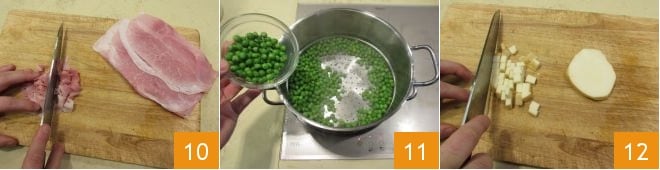 Meanwhile, cut the ham into cubes 10. Steam the peas for 2 minutes 11 and also cut the smoked provolone into small cubes 12.